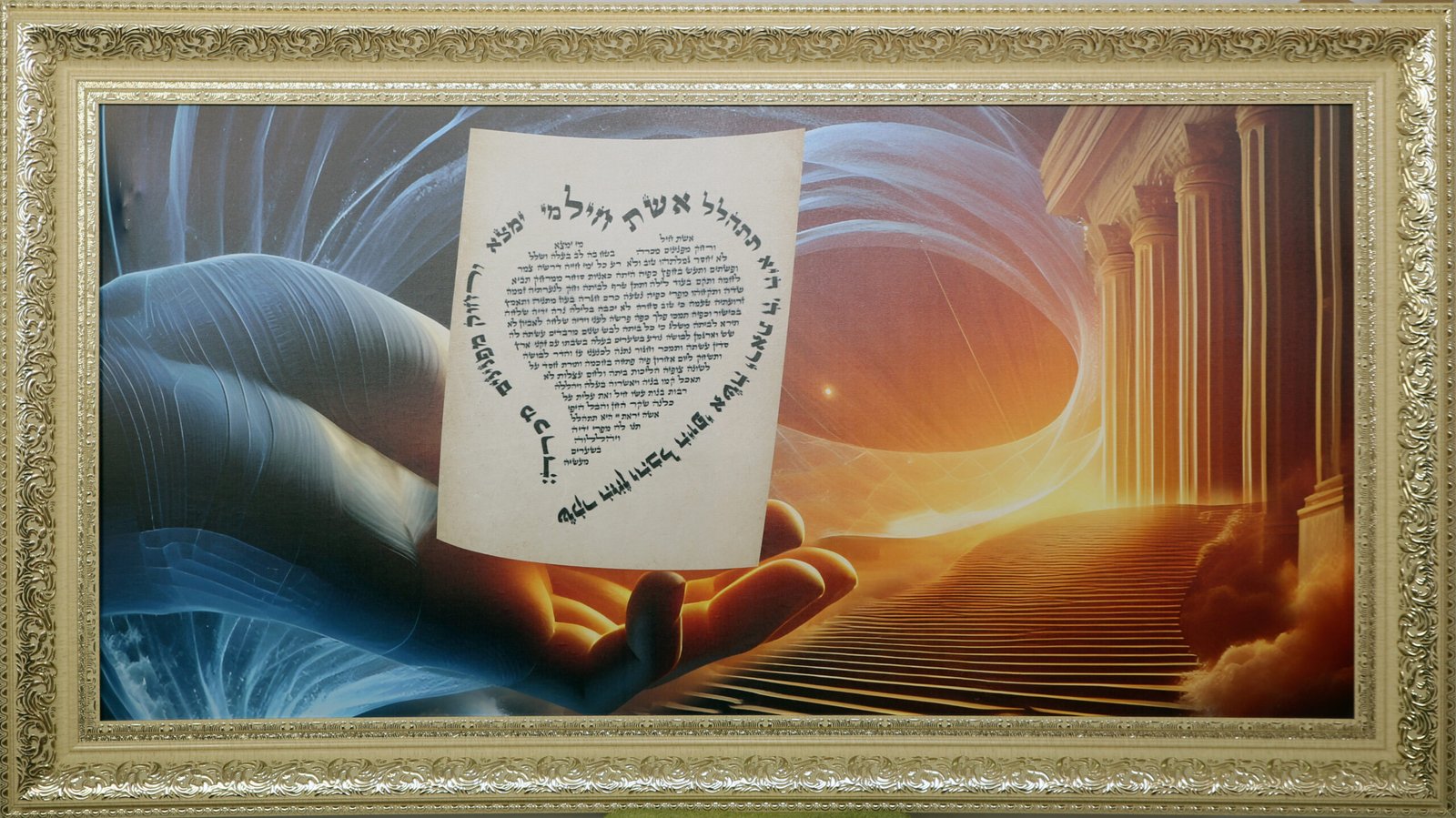 אנו ב hoffer judaica יצרנו תמונה מרהיבה עם מזמור אשת חיל בעיצוב ייחודי, נכתב על קלף כשר על ידי סופר תלמיד חכם. סגולה לזוגיות טובה ושלום בית. ספציפית לאשה מיוחדת.